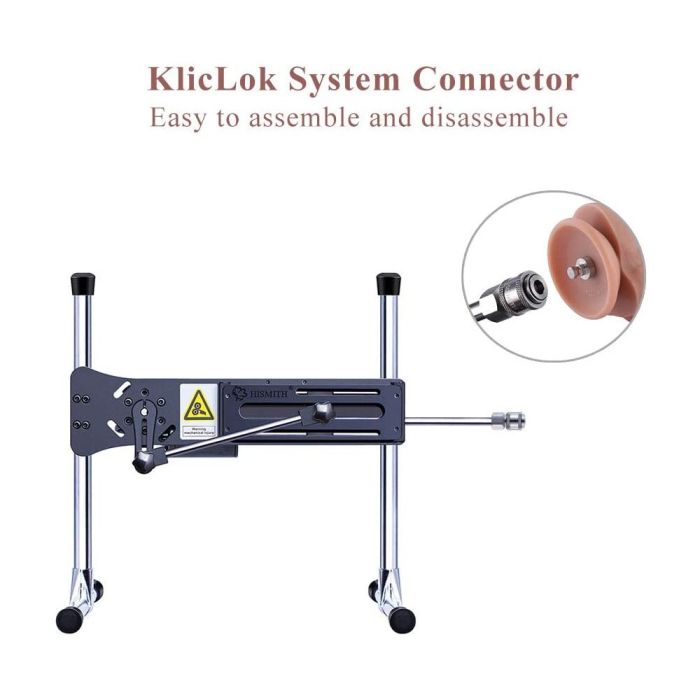 Kliclok is a quick connection mechanism for sex machines and related accessories. It is an enhanced version of the Quick Air system with a hexagonal male connector and corresponding female connector. Kliclok tackles the issue of attachments rotating during operation by building on Quick Air's quick insertion and removal capability. The hexagonal design provides a secure and stable connection, avoiding any unwanted movement or rotation while in operation.